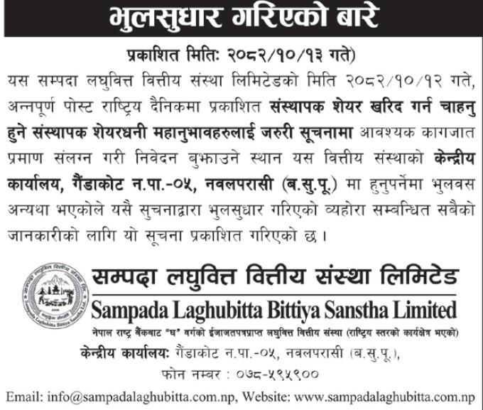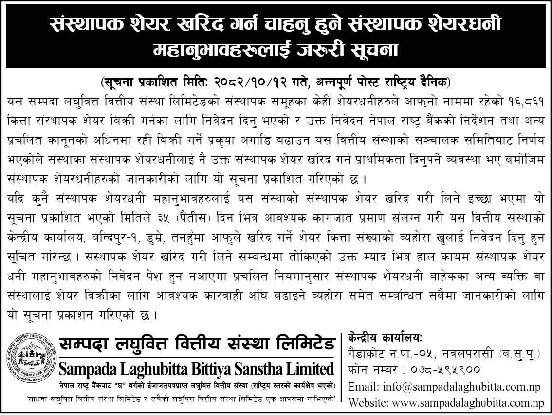 Sampada Laghubitta Bittiya Sanstha Limited (SMPDA) promoted by reputed individuals peoples, is a national level microfinance Institution licensed by Nepal Rastra Bank, the central bank of Nepal.