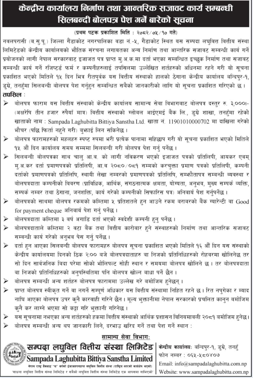 कार्यालय निमार्ण तथा आन्तरिक सजावट कार्य सम्बन्धी सिलबन्दी बोलपत्र पेश गर्ने बारेको सूचना